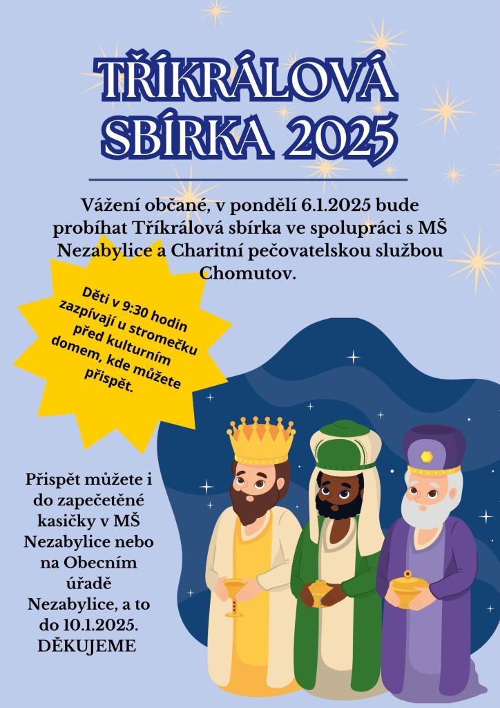 Vážení občané, v pondělí 6.1.2025 bude probíhat Tříkrálová sbírka ve spolupráci s MŠ Nezabylice a Charitní pečovatelskou službou Chomutov.