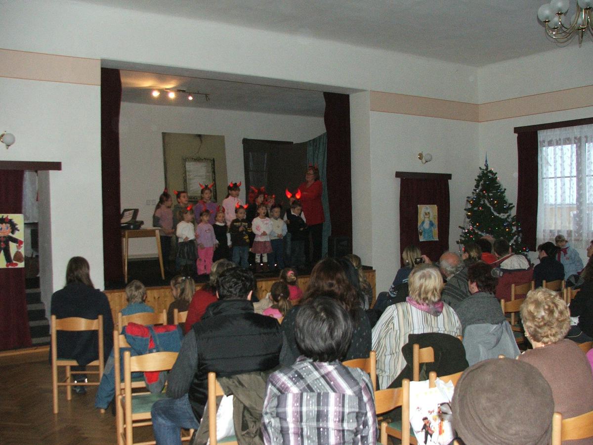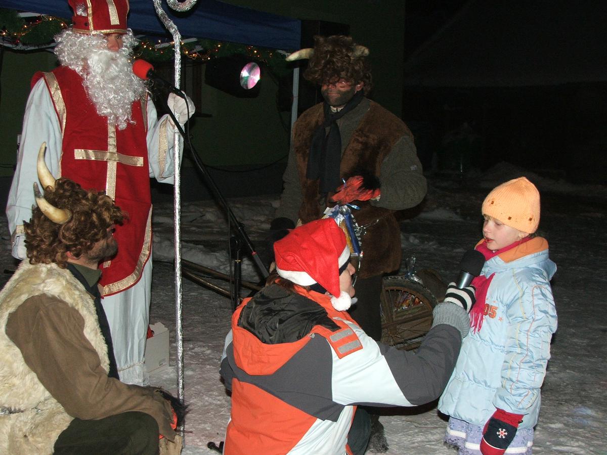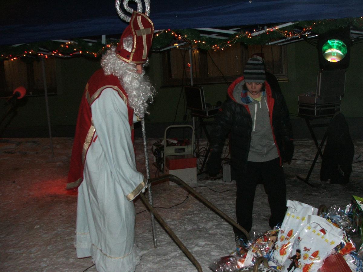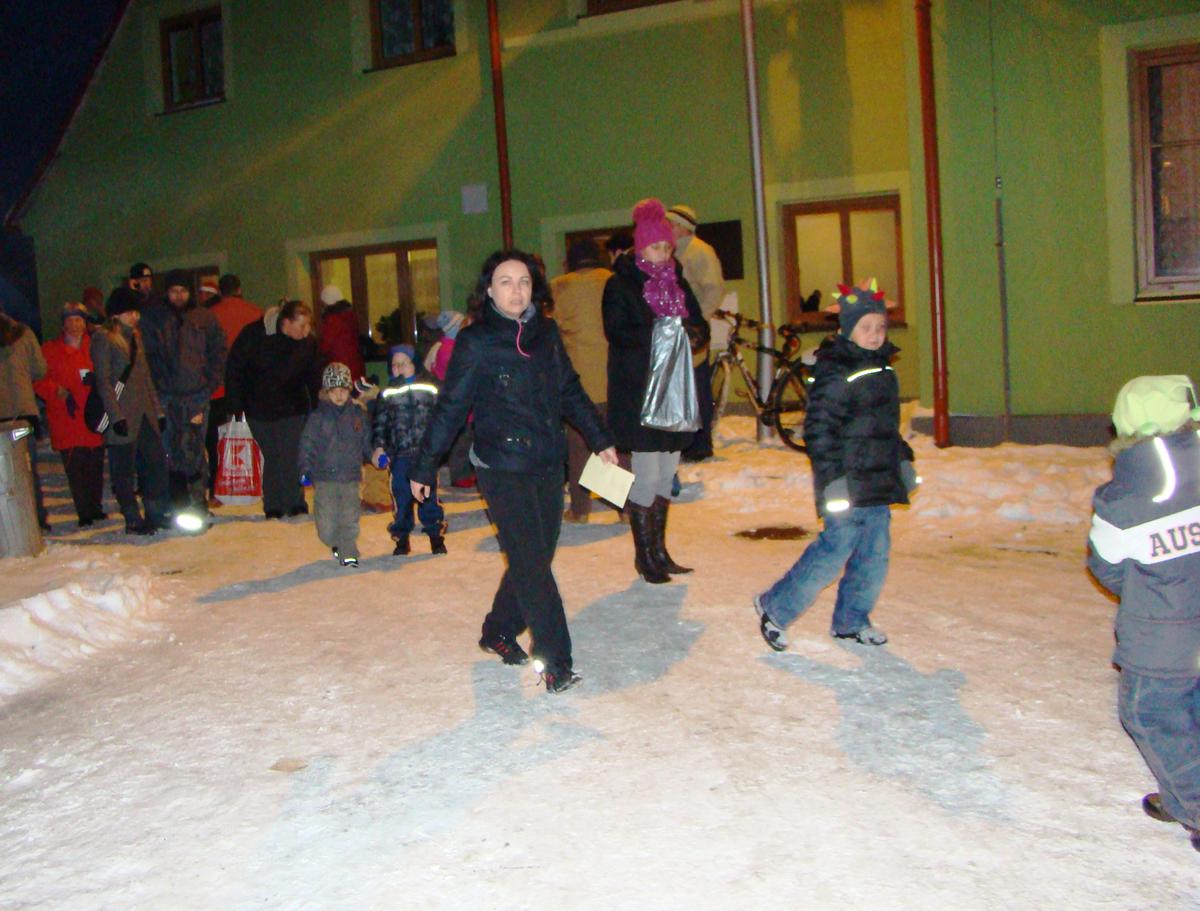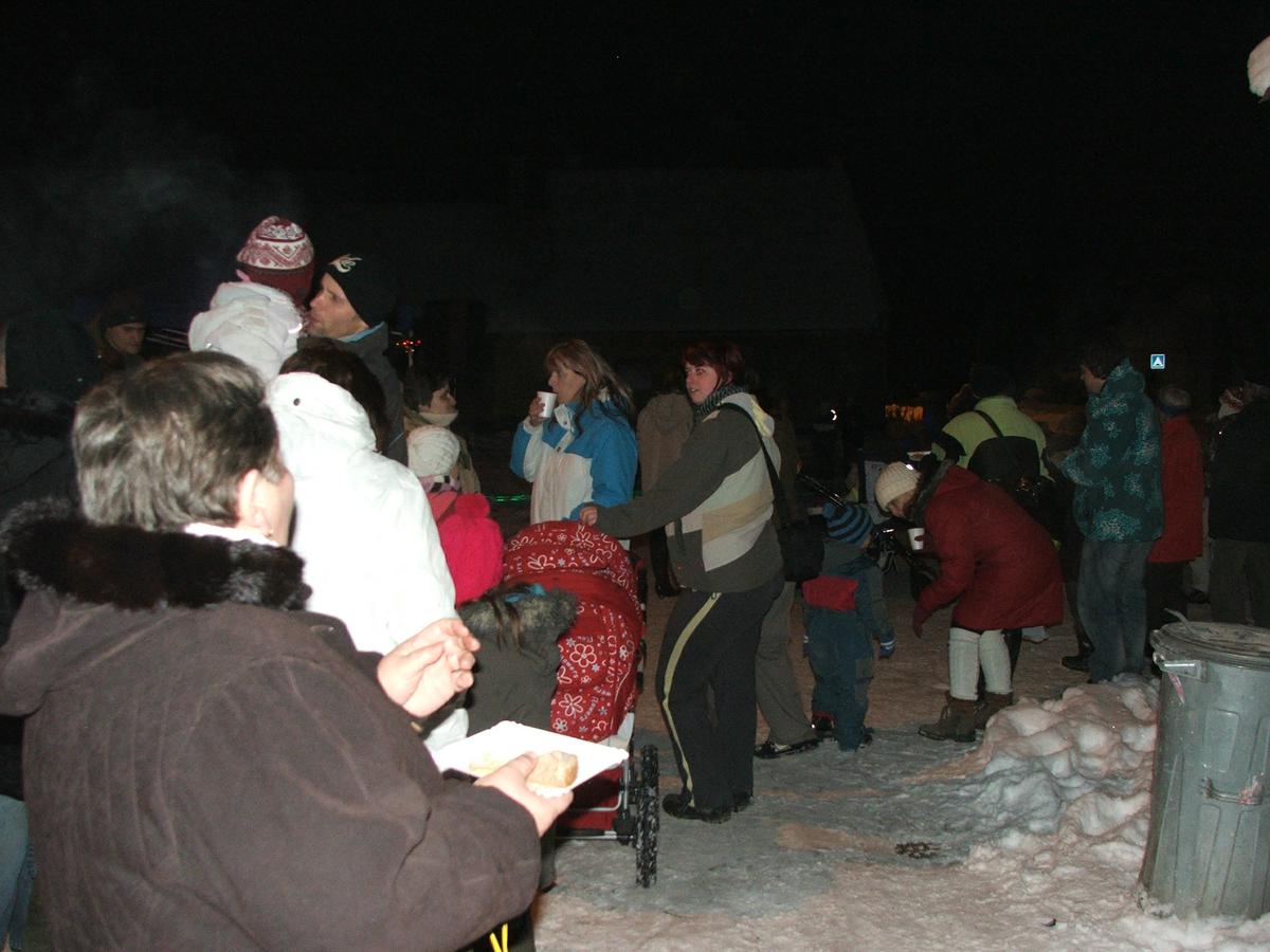 Po přehlídce umění divadelního a tvořivého jsme se přemístili před KD na náves, kde na nás již čekaly upečené buřty, svařák, pro děti nealkoholický punč a horký čaj a samozřejmě zábava pod vedením Jarušky Válkové a Tomáše Schauera. Ti nám ukrátili čekání na Mikuláše s čerty a nadílku pro hodné děti.