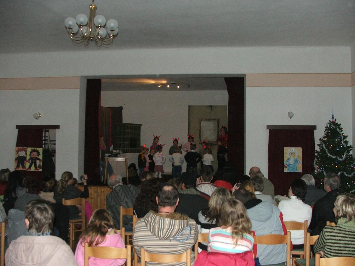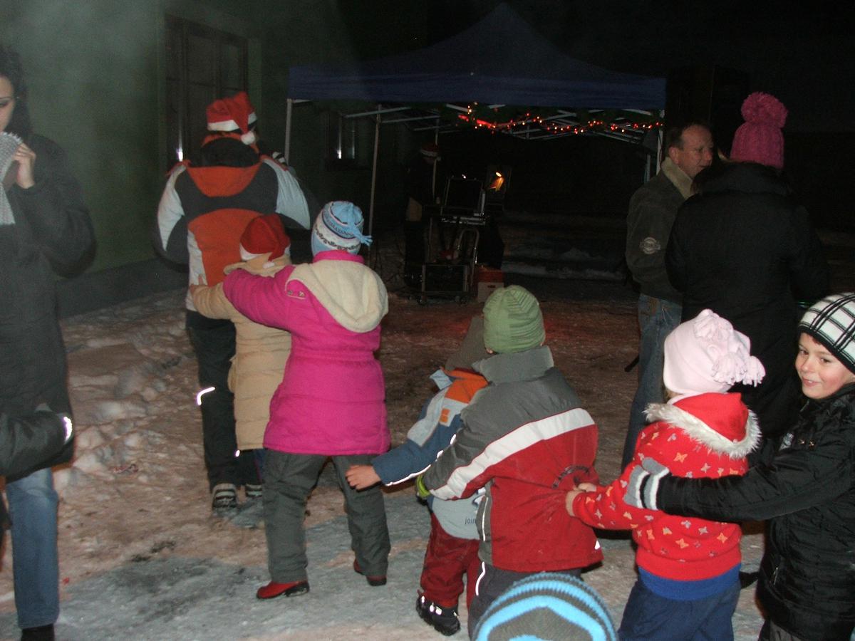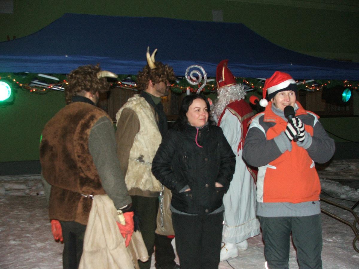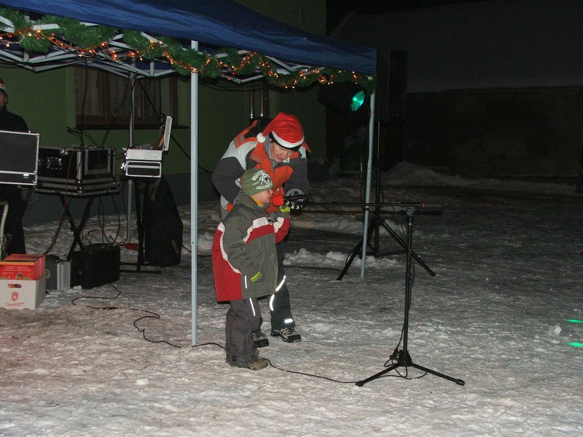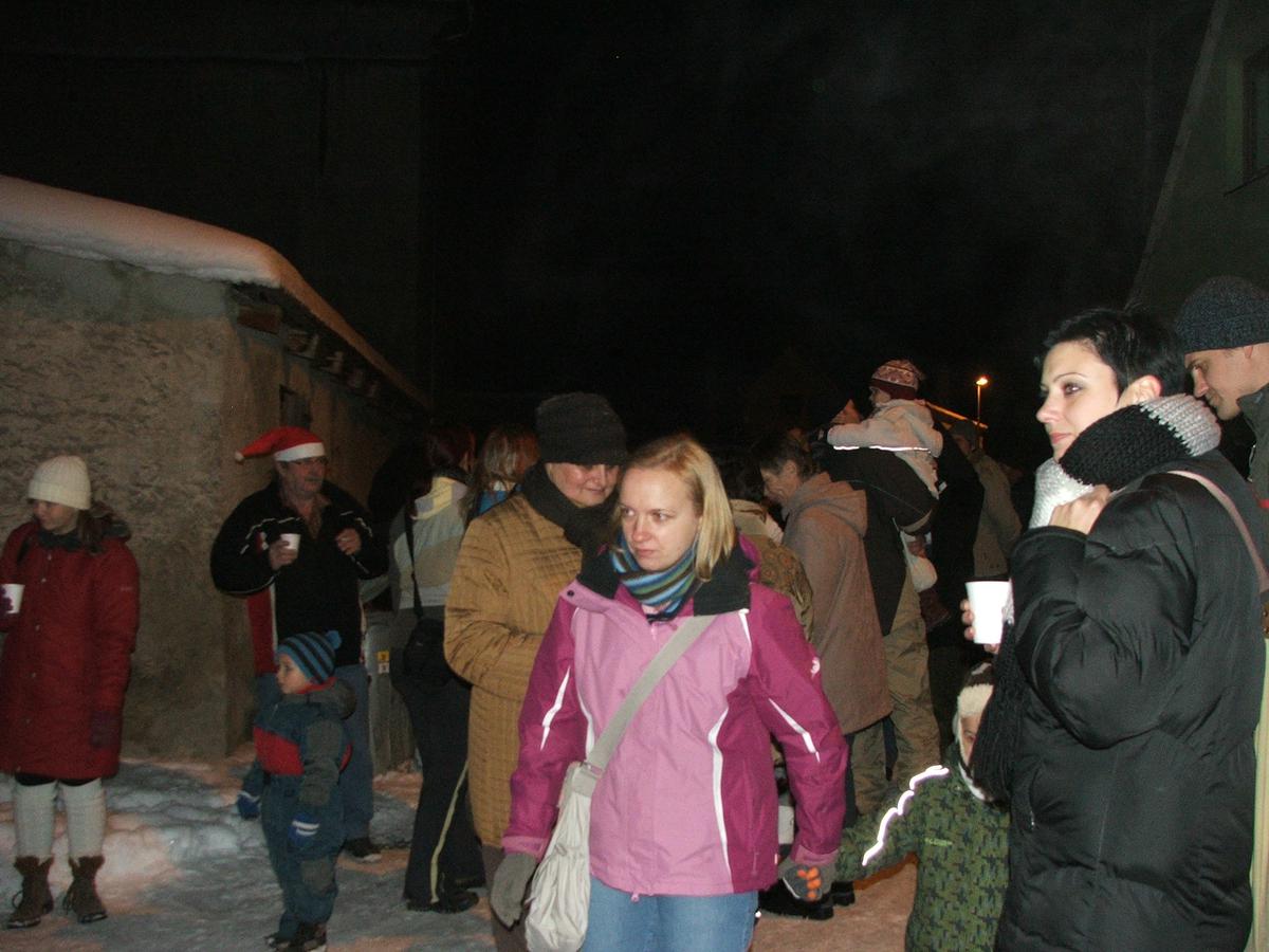 Po přehlídce umění divadelního a tvořivého jsme se přemístili před KD na náves, kde na nás již čekaly upečené buřty, svařák, pro děti nealkoholický punč a horký čaj a samozřejmě zábava pod vedením Jarušky Válkové a Tomáše Schauera. Ti nám ukrátili čekání na Mikuláše s čerty a nadílku pro hodné děti.