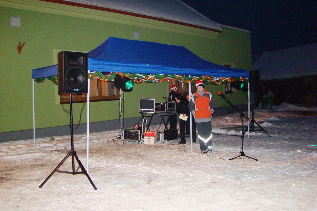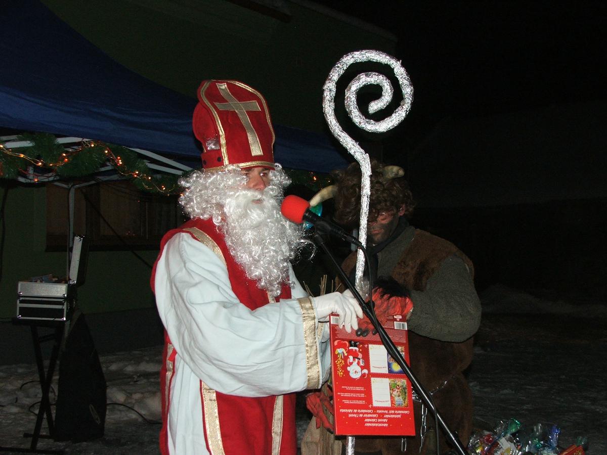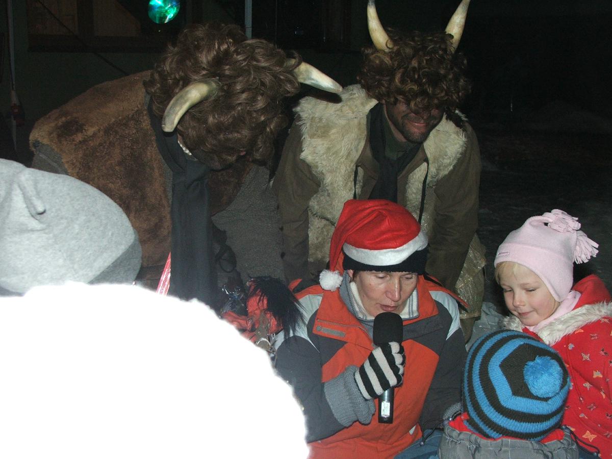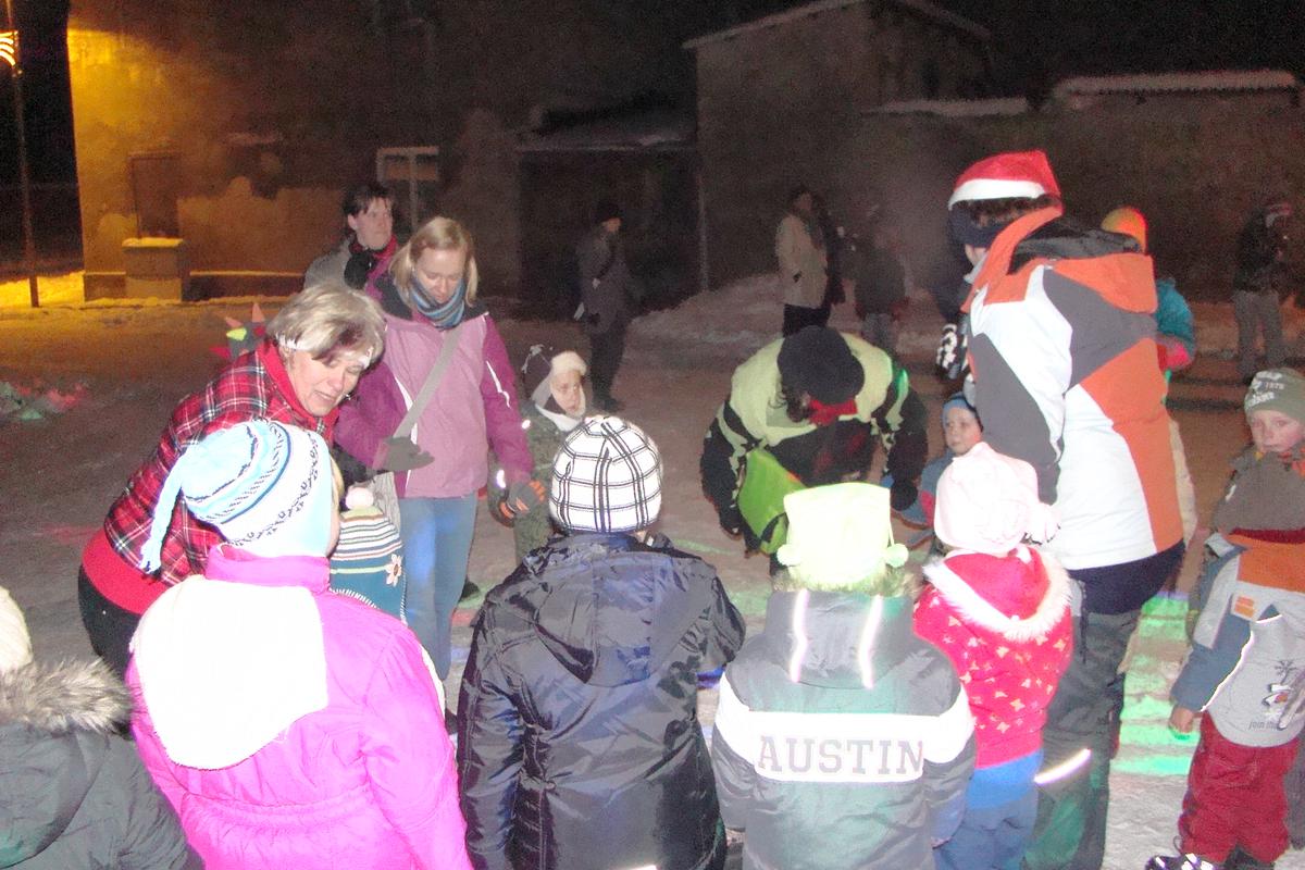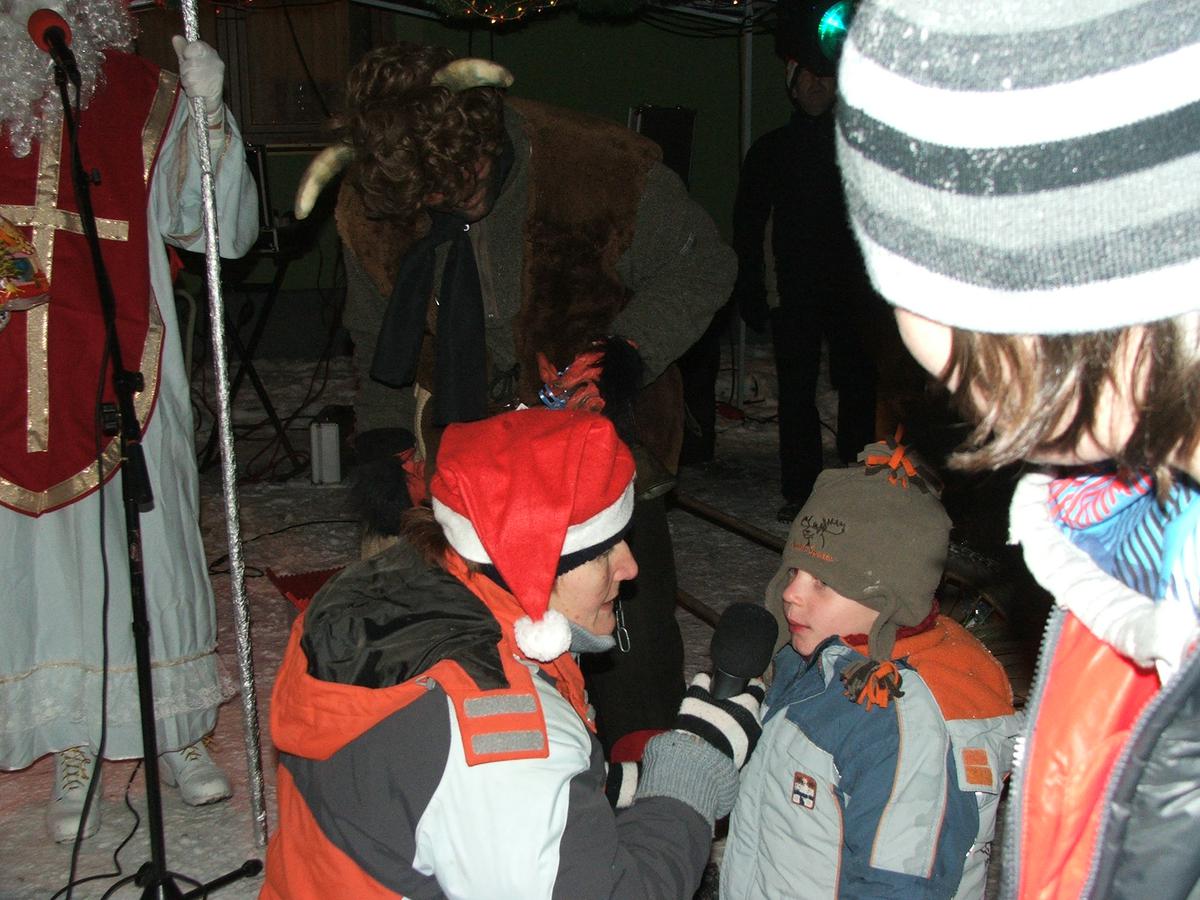 Po přehlídce umění divadelního a tvořivého jsme se přemístili před KD na náves, kde na nás již čekaly upečené buřty, svařák, pro děti nealkoholický punč a horký čaj a samozřejmě zábava pod vedením Jarušky Válkové a Tomáše Schauera. Ti nám ukrátili čekání na Mikuláše s čerty a nadílku pro hodné děti.