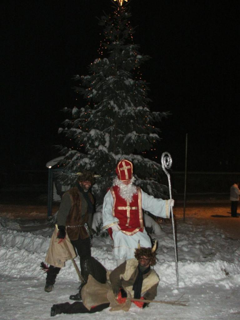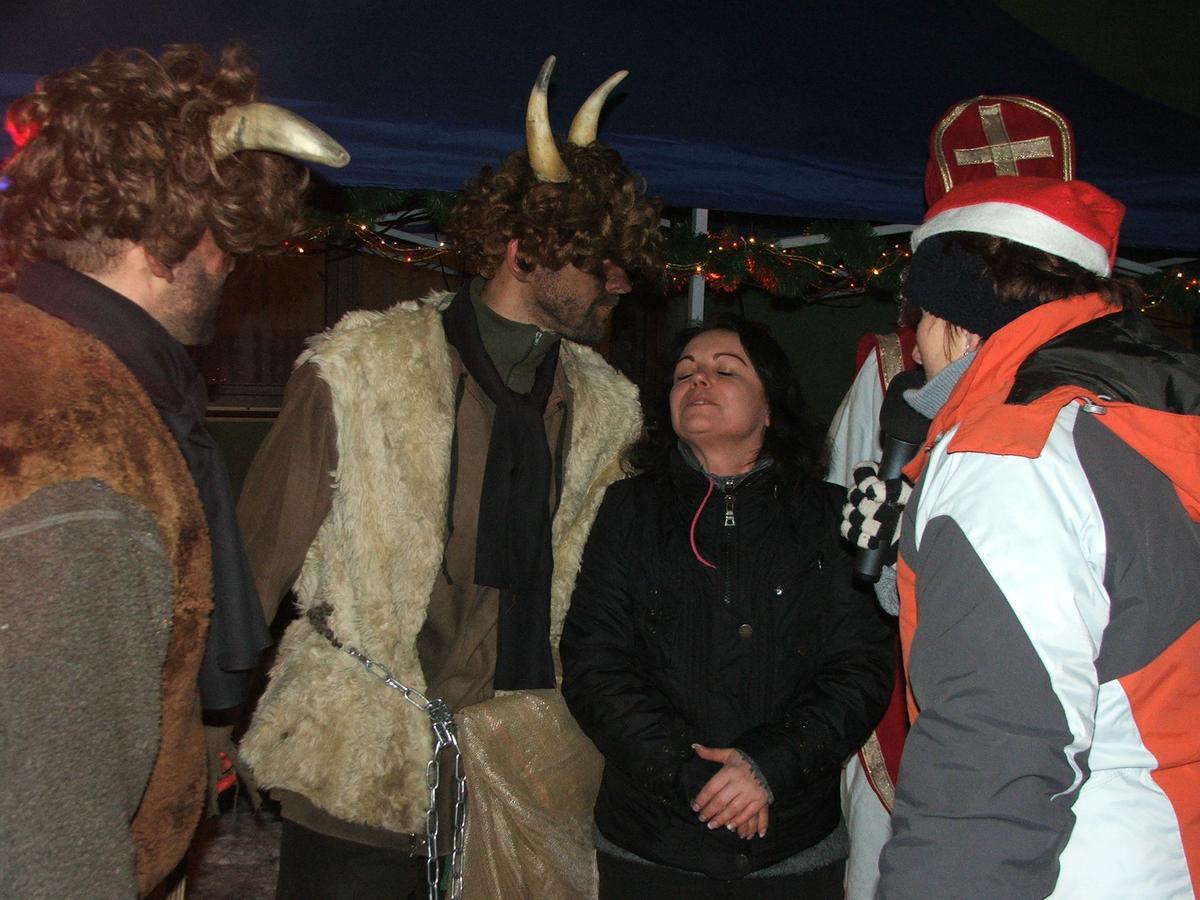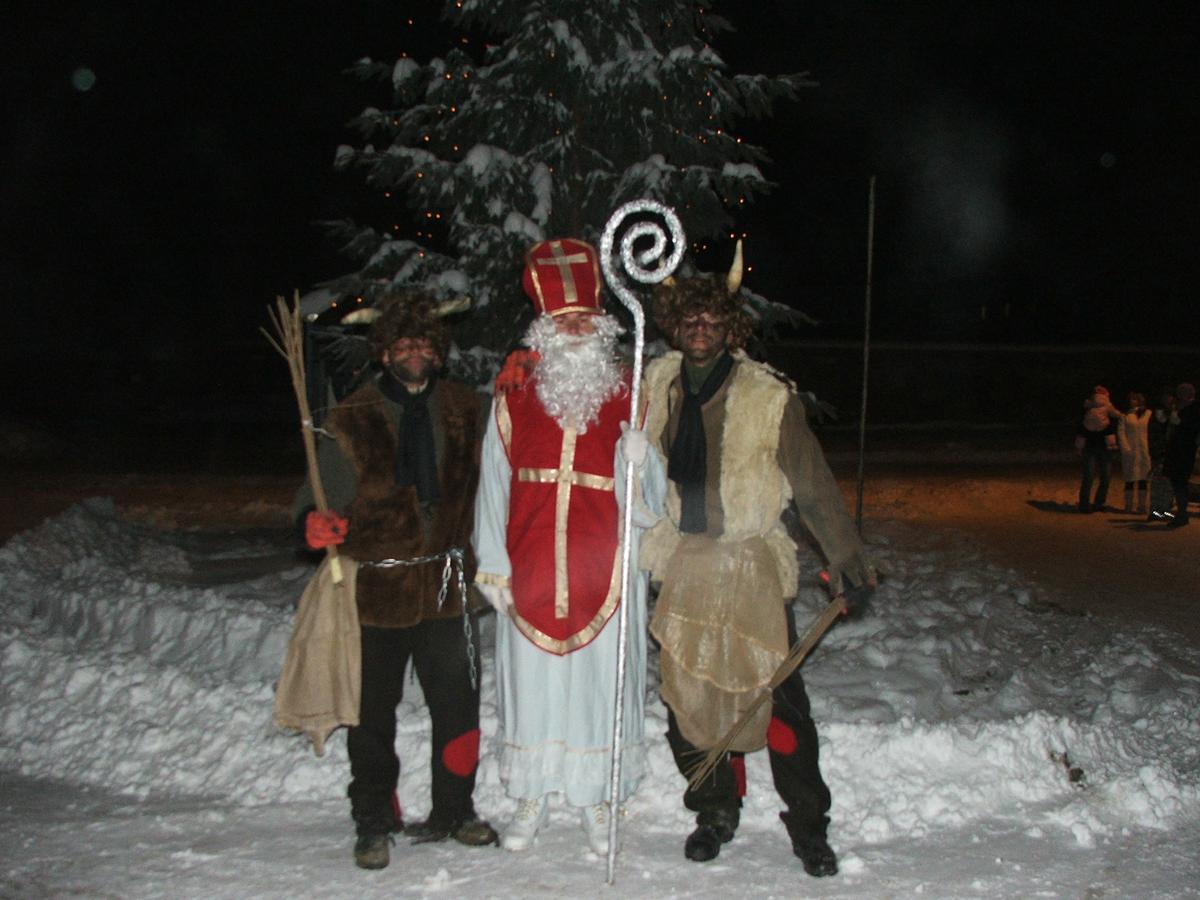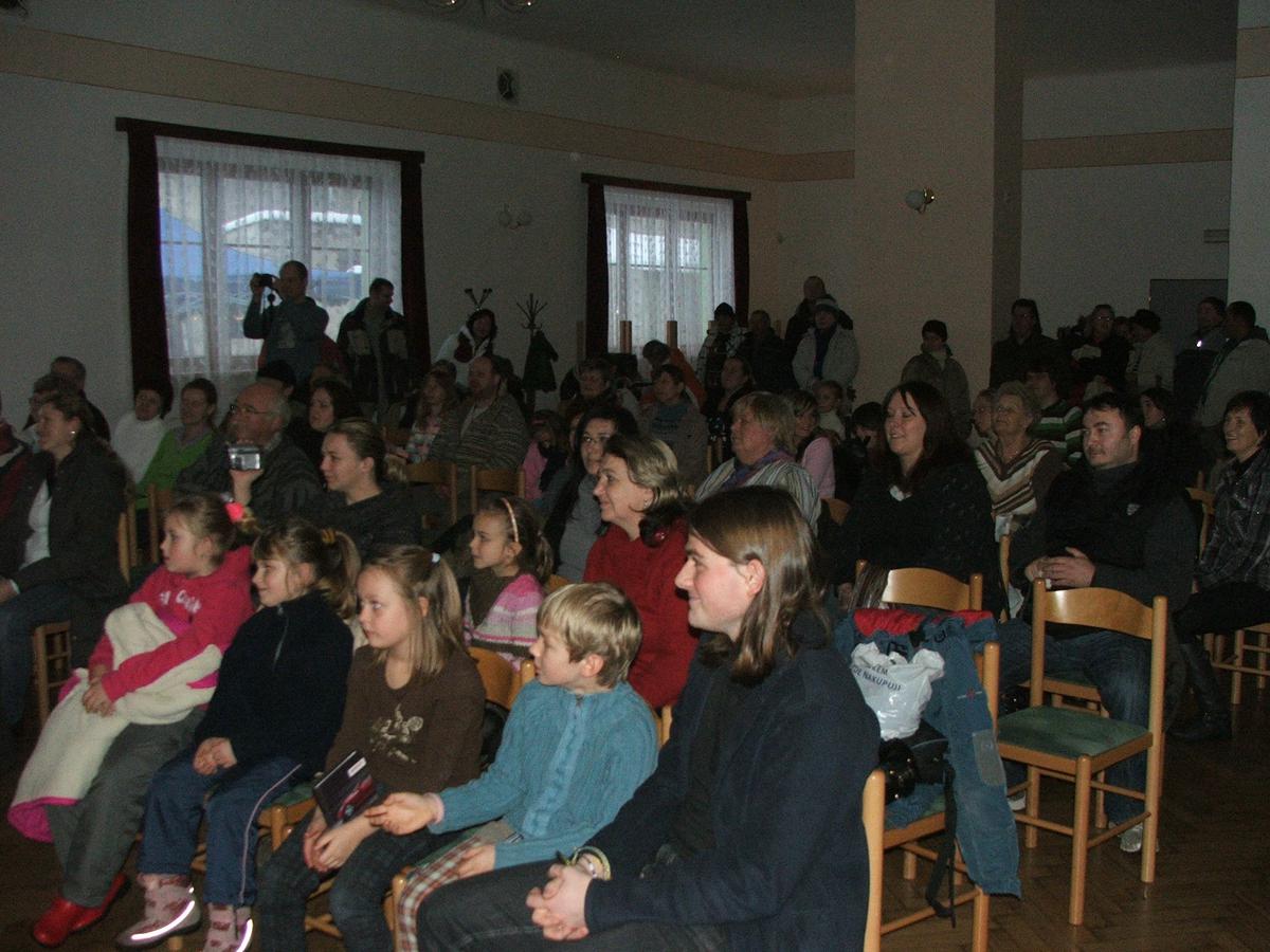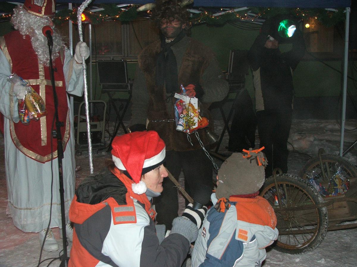 Po přehlídce umění divadelního a tvořivého jsme se přemístili před KD na náves, kde na nás již čekaly upečené buřty, svařák, pro děti nealkoholický punč a horký čaj a samozřejmě zábava pod vedením Jarušky Válkové a Tomáše Schauera. Ti nám ukrátili čekání na Mikuláše s čerty a nadílku pro hodné děti.