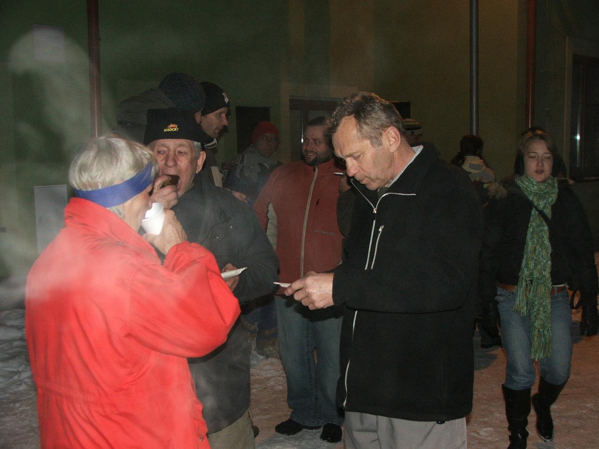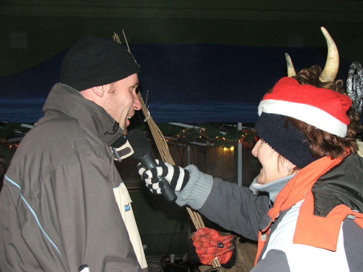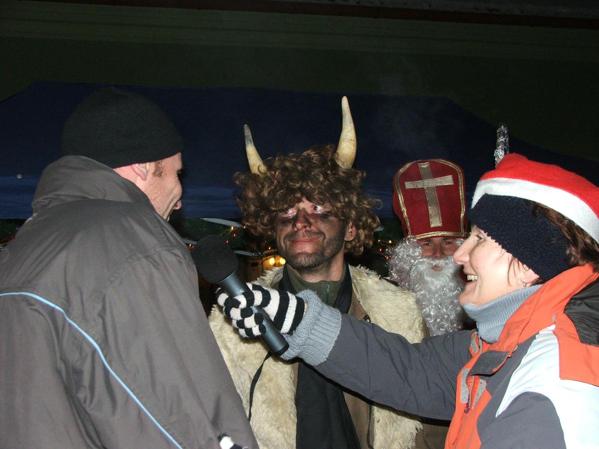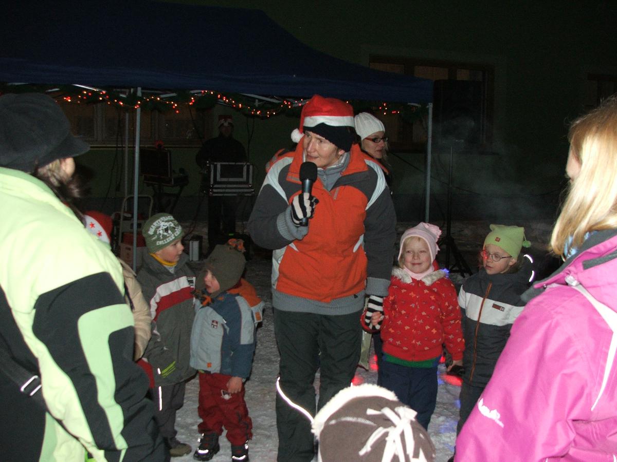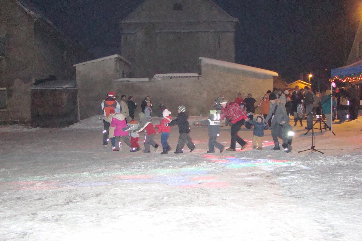 Po přehlídce umění divadelního a tvořivého jsme se přemístili před KD na náves, kde na nás již čekaly upečené buřty, svařák, pro děti nealkoholický punč a horký čaj a samozřejmě zábava pod vedením Jarušky Válkové a Tomáše Schauera. Ti nám ukrátili čekání na Mikuláše s čerty a nadílku pro hodné děti.